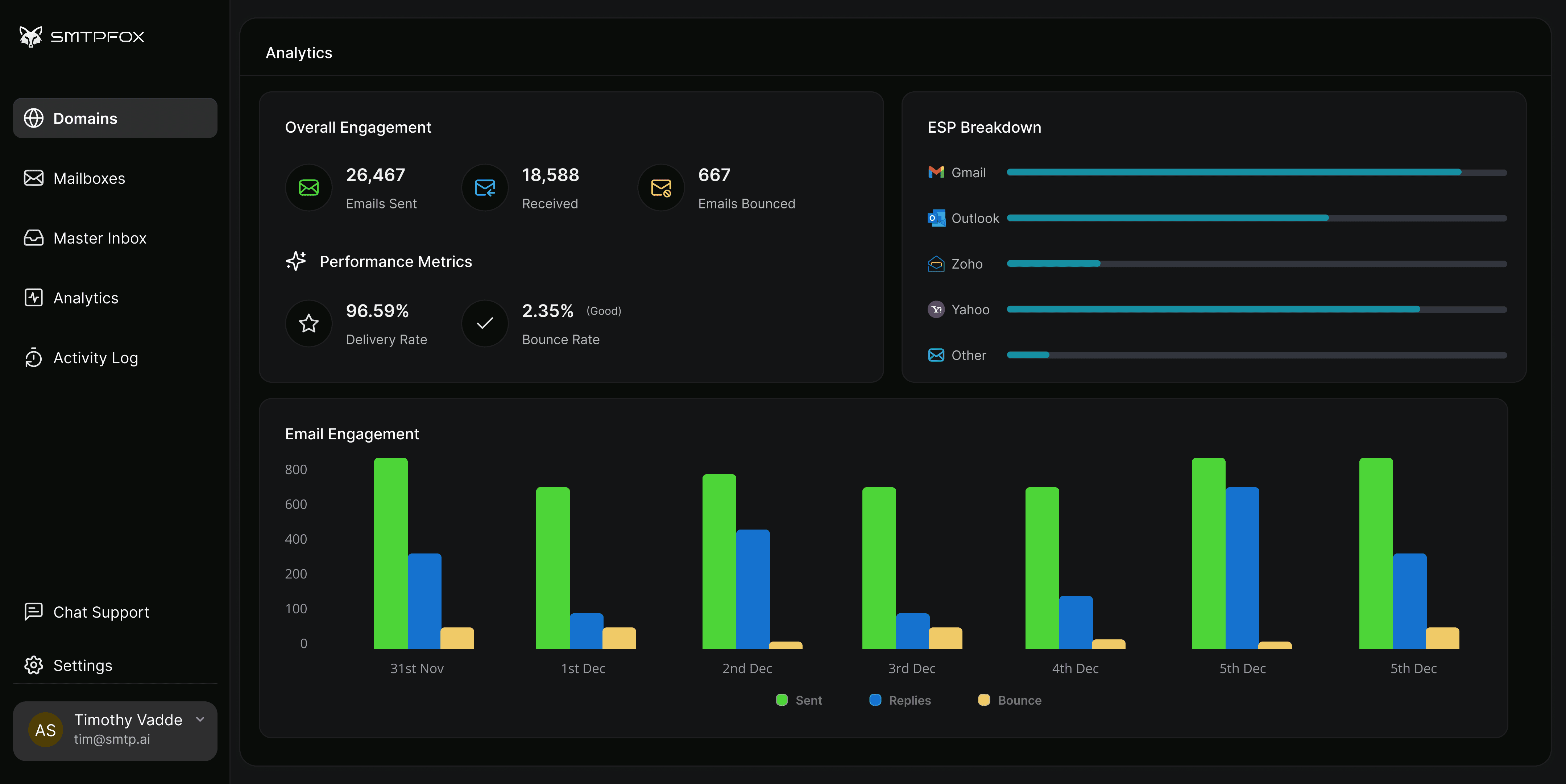 SMTPFOX fixes it all — automatically. Dedicated clean infrastructure, instant authentication, centralized replies, and real-time protection. Send boldly. Scale fearlessly.
