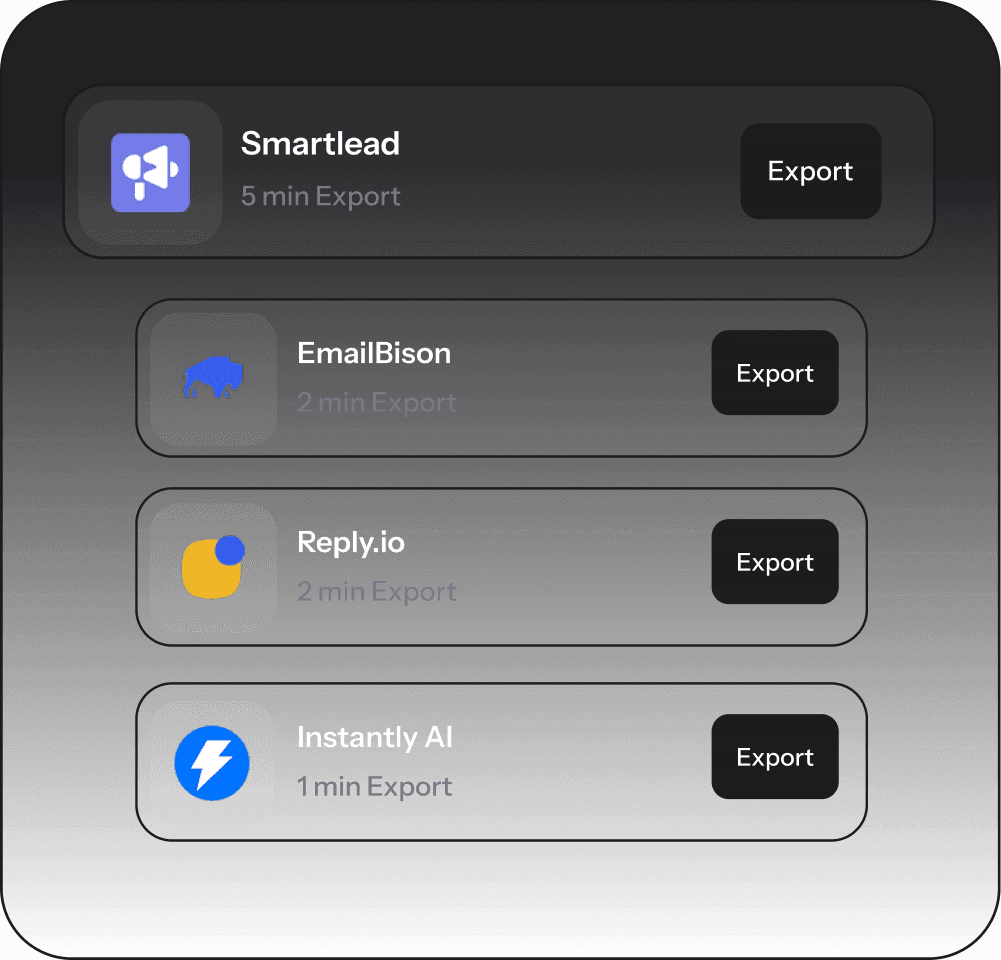 We work seamlessly with all major cold email platforms: Emailbison • Instantly • Smartlead • Lemlist • Woodpecker • Apollo • Outreach • Clay • Saleshandy • Reply.io • and more via SMTP credentials or API.